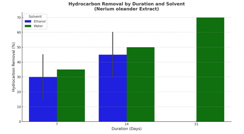 Oleander extract (10%): Duration 14 days: 10% oleander extract displayed the highest removal efficiency of hydrocarbons and achieved the removal of 70%.