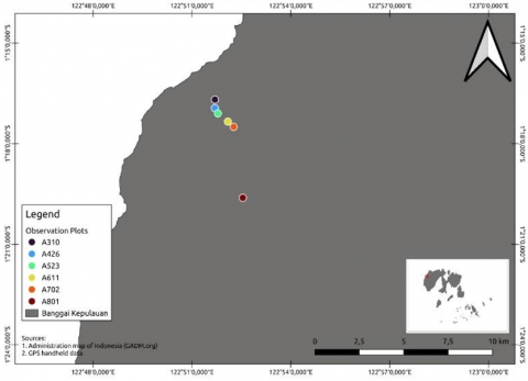 Figure 1. Research site (red mark) in Kokolomboi Biodiversity Park, Banggai Islands