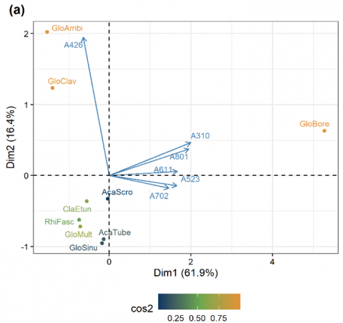 The squared cosine (cos2) value from the PCA shows that Glomus boreale (cos2 0.98 at Dim1) is the most important AM fungus in the observed community. Furthermore, A. tuberculata and G. sinuosum are AM fungal species with low cos2 values because they are only found in 1 plot with low abundance. The high cos2 value indicates that PCA well represents these AM fungal species [45, 46]. The eigenvalue shows that Dim1 in PCA can explain more than 50% of the variance in the analyzed data (Figure 7). Dim1 represents the elevation gradients except the elevation of 426 masl, which is well represented by Dim2. Based on Figure 7, a significant correlation is also seen between the plot at an elevation of 310 masl (A310) and the plot at an elevation of 801 masl (A801). Likewise, the plots at elevations of 523 and 702 masl. The abundance of AM fungi in each plot also influences the correlation between the plots. The directions and length of the arrows indicate the correlation and contribution of each variable to Dim1 and Dim2. In this study, we found that elevation of 310 masl is the most contributing variable for Dim1, followed by elevation of 801 masl and elevation of 611 masl, respectively.