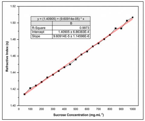 Based on the sucrose standard curve, a linear equation (y = 1.40905 + 9.60914e-05) with R2 = 0.9973 was obtained. This equation was used to calculate the final concentration of sucrose after the reaction. The sucrose standard curve was utilized to determine the relationship between the refractive index and the sample concentration.