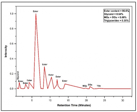 The CPKOME was analyzed to determine the physical and chemical characteristics. The characteristics consist of ester content (MPOB p3.4) [19], acid value (AOCS Ca 5a-40-1998), saponification value (AOCS Cd 3-25-1998), water content (AOCS Ca-2c-25-1998) [20], impurities (AOCS Ca 3a-46-1998), density (IOPRI, 2004) [21], and unreacted methanol [22].
