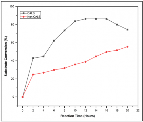 The majority of reactions using CALB require a longer reaction time. This is primarily due to the ability of CALB to break down or synthesize substrates under specific conditions. Determining the appropriate reaction time is essential to identify the minimum duration needed to achieve optimal substrate conversion. The selection of reaction time is informed by several previous studies. A study was conducted to observe the yield of sucrose caprate formed at a reaction time of 1-3 h. Another study investigated the synthesis of oligofructose esters using oligofructose and short to long fatty acids (C8 to C18) in DMSO solvent using Novozyme 435. The reaction times evaluated were 16 h, 39 h, and 63 h, resulting in substrate conversions of 27%, 24%, and 36%, respectively. The use of reaction times above 16 hours showed a decrease in substrate conversion [27]. While at the reaction time of 39-63 h, there was an increase in substrate conversion due to the addition of Novozyme 435 in the reaction system. This shows that the enzyme ratio and reaction time interact in an enzymatic reaction. Additionally, another research has been conducted [28], highlighting the relationship between CALB and reaction temperature in SEs production, where an increase in reaction temperature ≥ 75℃ results in a decrease in product yield, as CALB begins to undergo protein denaturation.