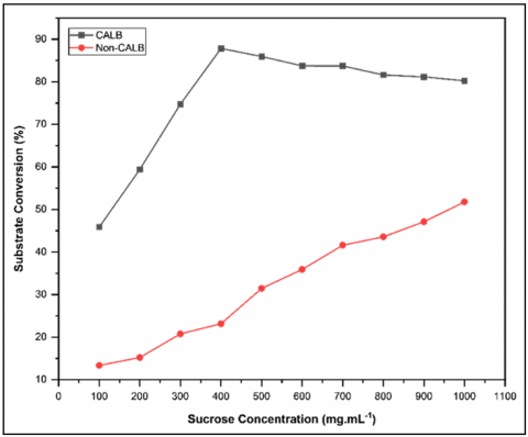 The results showed that reaction temperature affects the stability of CALB and the solubility of reactants. Immobilized CALB can be used at temperatures between 60-80℃ without significant loss of catalytic activity. These findings were taken into consideration when determining the reaction time for SEs synthesis, which was carried out for 20 h, with 2 h intervals for each treatment. Other parameters were maintained at a fixed temperature of 30℃, sucrose concentration of 600 mg.mL-1, and CALB load of 50 mg. As a control reaction was performed under the same experimental conditions. Substrate conversion was measured by monitoring the decrease in sucrose concentration at the end of the reaction. The decrease in initial sucrose concentration indicates that the O-H bond in sucrose has been broken and bound to the ester group.