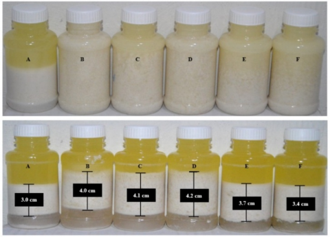 Creaming index (%) $=\frac{\mathrm{H}_1}{\mathrm{H}_0} \times 100$ (2)
