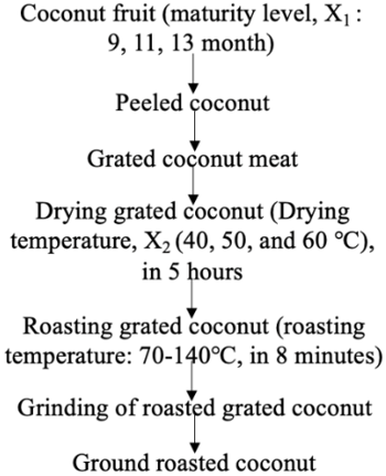 In recent years, ground roasted coconut has become increasingly popular as a versatile ingredient in cooking spices, chicken curry, duck curry, and beef rendang, valued for its distinctive aroma, mouthfeel, and nutrient profile. Despite this burgeoning interest, most research has concentrated on industrial-scale drying of coconut kernels, desiccated coconut, or grated coconut [6], leaving the specific processing pathways to optimise roasted coconut quality underexplored.