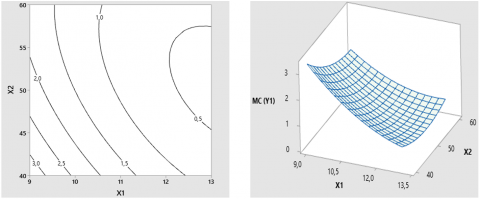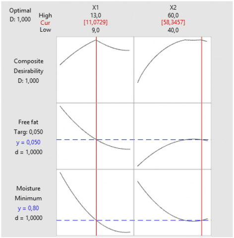 Data analysis was conducted using a two-factor CCD [22-28], enabling the assessment of interactions between coconut maturity level (X1) and drying temperature (X2). The objective was to identify optimal processing conditions that influence the physicochemical quality of the ground roasted coconut produced.