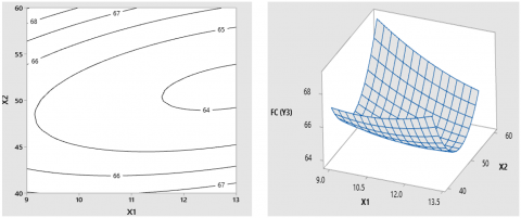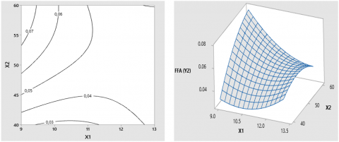 where, Y is the value of the treatment response (moisture content, FFA, FC); βo is an intercept/constant; β1 and β2 are linear coefficients; β11and β22 are quadratic coefficients; β12 is a treatment interaction coefficient, namely the age of the coconut fruit (X1) and the drying temperature (X2).