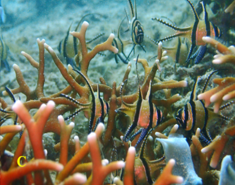 Figure 7. (A-B) The Pterapogon kauderni lives in shallow water and is associated with sea urchins as a microhabitat, (C) The Fire Coral (Millepora sp.) is another microhabitat for P. kauderni