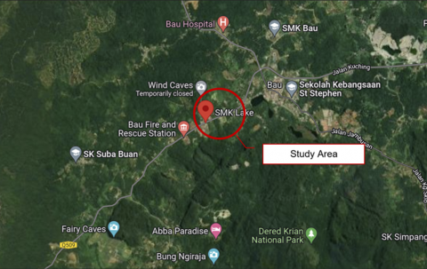 The study area is located in the Bau region, about 30 km southwest of Kuching, Sarawak, Malaysia. Figure 1 shows the location of the study area on Google Maps. This area is renowned for its vast karst formations, which have developed over long geological periods through the dissolution of underlying limestone rocks. Close by are the limestone caverns called Wind Cave and Fairy Cave. Because of the distinctive geological configuration of the karst topography, the region is popular for geotourism.