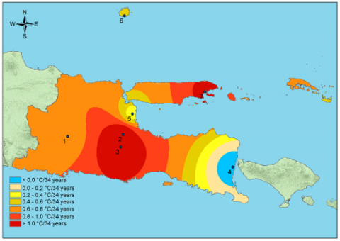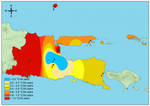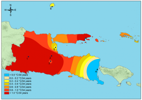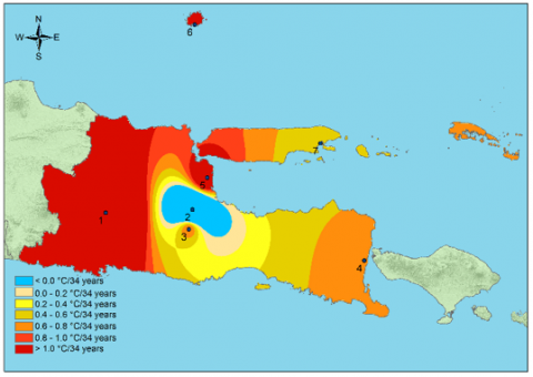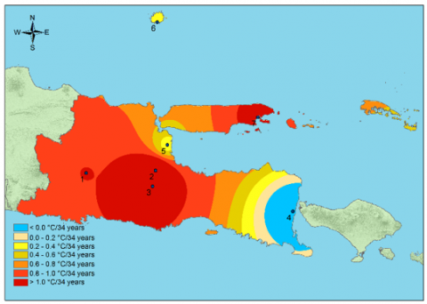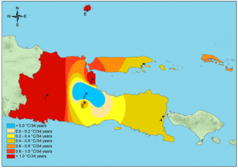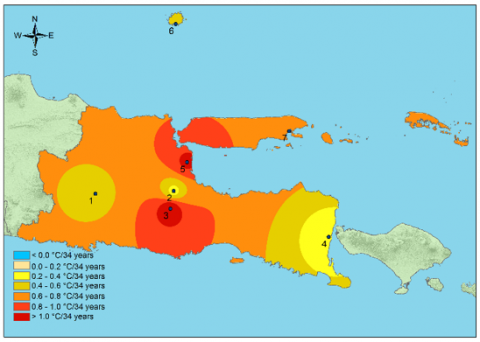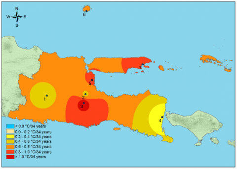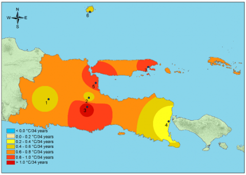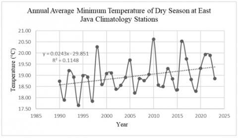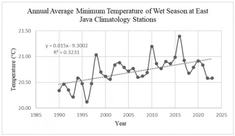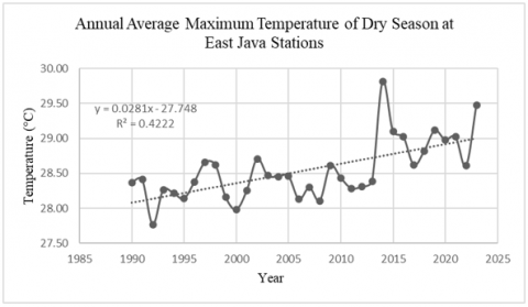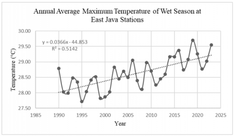 2. The rate of change, assessed at seven climate stations in East Java Province, particularly at the East Java Climatology Station near Wlingi Reservoir, shows an annual average temperature increase of more than 1.0℃ in 34 years. If the increase continues, future temperatures could be even hotter.