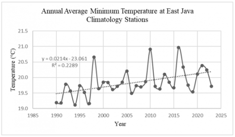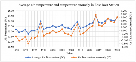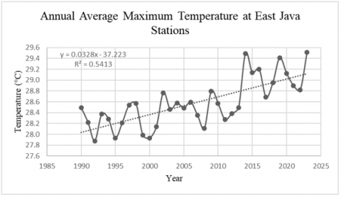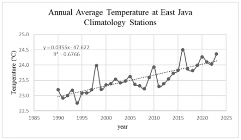 1. Based on data from the BMKG, there is a positive trend of increasing annual air temperature in East Java Province between 1990 and 2023. This causes the earth’s surface to become warmer.
