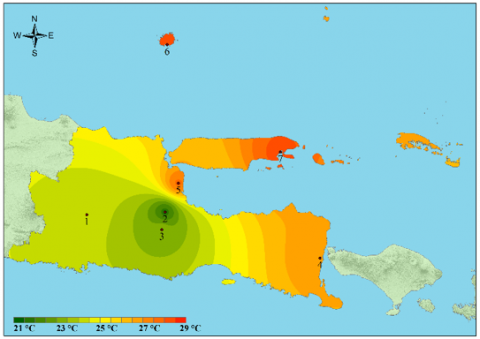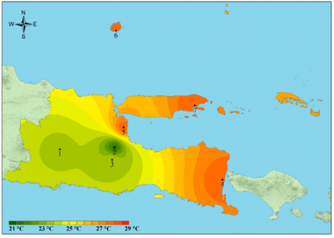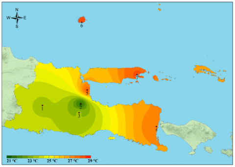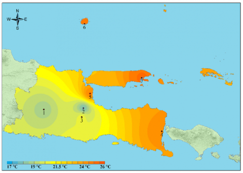 The study was conducted statistically and spatially. A spatial overview is performed to make it easier to understand the distribution of temperature data. The software used to perform spatial analysis is Arcmap 10.3. The spatial analysis uses the Inverse Distance Weighting (IDW) tool. In the IDW interpolation method, sample points are weighted during interpolation such that the influence of one point relative to another decreases with distance from the unknown point of interest [32].