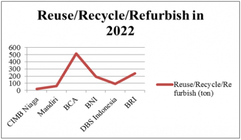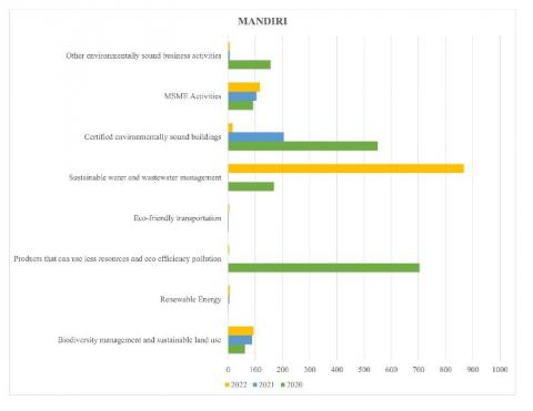Fourth, the aspect of reuse/recycle/refurbishment can be reviewed from the waste management Mandiri Bank has implemented. It has succeeded in managing 62 tons of inorganic waste. Meanwhile, the volume of organic waste processed by the biodigester machine was 1,129 kg. Fifth, the aspect of paperwork or paperless, where Mandiri Bank utilized 1,336 tons of paper. This amount has decreased by 19.6% compared to the previous year. This achievement was supported by digital banking and the operation of customers’ paperless administration [43]. Sixth, the aspect of green investment, can be seen from the green investment activities. It showed that Mandiri Bank has carried out various funding. Moreover, it has also issued sustainability bonds with a total demand order of more than US\$ 2.5 billion during the book-building process. Thus, there was an exceeding demand of more than 8.3 times the plan for the amount of bonds that were to be issued. This showed that there was a positive perception and appreciation from foreign investors towards the work program and business prospects of Mandiri Bank in the future, especially related to sustainable finance. In February 2022, Mandiri Bank issued the first ESG Repurchase Agreement (Repo) in Indonesia, which was one of the first movers in Southeast Asia. A transaction amounting to US\$ 500 million was used to fund or refund green and social business activities with criteria based on the Sustainability Bond Framework of Mandiri Bank. Mandiri Bank has allocated funds with a total of Rp 208.8 million to Rp 231 million to buy carbon units in the Carbon Exchange, which aims to decrease carbon emissions and increase investment in sustainable projects. Thus, Carbon Exchange is included in the indicator of green banking, namely carbon emission and green investment.