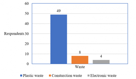As part of this research, community interviews were conducted to investigate factors that play a part in illegal plastic waste dumping in the area of interest. Among 61 families interviewed, 80.03% mentioned that they frequently encountered illegally dumped plastic waste, while construction waste was less common, and electronic waste was not only occasionally, as illustrated in Figure 5.