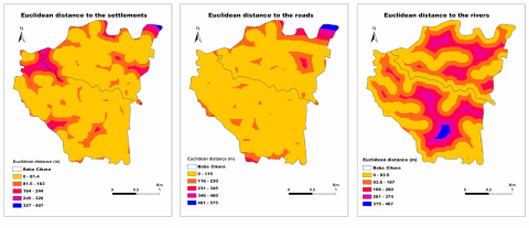 The distance from hotspots to various factors such as roads, water and settlements was determined by employing the Euclidian distance formula that Alexis Clairaut discovered in 1731, but it was updated by Herman Minkowski [34]. If P (x1, y2) and Q (x2, y2) are points in the plane, the Euclidean distance final formula (D) between P and Q would be:
