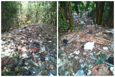 Figure 14. Plastic waste inhibiting the growth of bamboo (left) and other vegetation (right) in Cikarawang