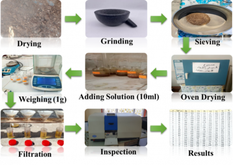 Following the representation in Figure 3, after collecting the samples, a mixing process was conducted for samples belonging to each study site to obtain twelve samples for heavy metal analysis. All samples went through to the electric furnace and drying stage, after that grinder was used to produce powders that were later sieved to obtain the desired impurity-free substance. The detailed importance of the heavy metal examination requested dough digestion of these samples. Three acids (HCl, H2SO4, HNO3) of different strengths are used for the digesting of samples. And 1g of each sample is weighed and put into a 100ml beaker, a special solution is added which is the mixture of the 2ml of nitric acid (HNO3), the 3ml of hydrochloric acid (HCl) and the 2ml of sulfuric acid (H2SO4).