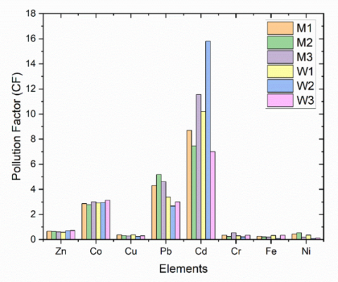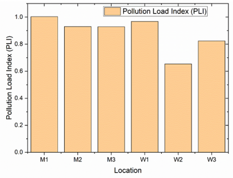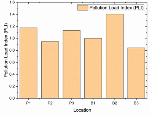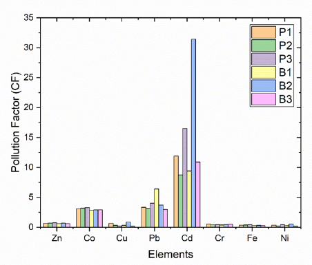 where, CF is the Contamination Factor for each metal calculated from Eq. (1), and n is the number of metals considered. This multiplicative approach provides a comprehensive measure of the pollution load, as it accounts for the combined effects of all heavy metals present in the soil.