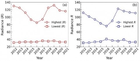 Figure 8. The trend of $\langle R\rangle$ that is obtained by numerical calculation (a) and the real-time Radiance R obtained from [26] (b) for Jakarta from 2012 to 2021