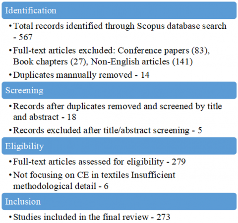 The Preferred Reporting Items for Systematic Reviews and Meta-Analyses (PRISMA) flow diagram (Figure 1) visually summarizes the screening process. Initially, we screened titles and abstracts for explicit references to CE in textiles, removing duplicates and irrelevant entries. The remaining articles underwent full-text assessment, during which studies lacking sufficient methodological detail or explicit discussion of CE were excluded. This process ultimately yielded 273 articles. While rigorous screening enhances the overall quality, it may also unintentionally exclude innovative studies that employ unconventional methods or explore emerging CE concepts.