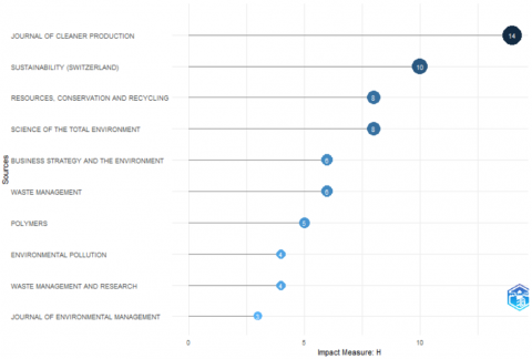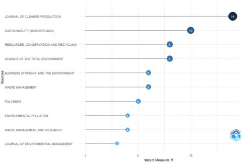 Figure 6 showcases the local influence of various sources, measured through the H-index, a widely recognized metric that gauges a journal’s significance by the number of its publications and citation rates. Experts typically suggest that higher H-index values correspond to greater influence within a field. In this analysis, the Journal of Cleaner Production leads with an H-index of 14, confirming its high citation rate and strong reputation in the scientific community. Sustainability (Switzerland) and Resources, Conservation and Recycling follow with H-index scores of 10 and 8, respectively, underscoring their sustained impact on research areas such as sustainability, ecology, and resource management. Other outlets exhibit a gradual decline in H-index, indicating a narrower audience or fewer influential publications. Nonetheless, journals like Science of the Total Environment and Business Strategy and the Environment continue to enrich discussions surrounding environmental and economic issues, even with comparatively lower H-index scores.