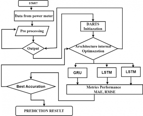 The data produced in measuring the use of power or electrical energy is generally consistent at the same time for all variables being measured. Therefore, the results of recording these measurements are in the form of time series data. In most buildings, the process of recording measurement results is still done manually in the form of log sheets. Due to manual recording, the volume of data currently available on a building is limited. Due to limited data volume, the proposal in this research is to build a prediction model for electrical energy use by utilizing the advantages and disadvantages of deep learning neural network models. Deep learning models include Recurrent Neural Network (RNN), Long Short-Term Memory (LSTM) and Gate Recurrent Unit (GRU). Utilizing the advantages and disadvantages of this neural network model is hereinafter called an ensemble. The obstacle faced in ensembles is that they require repeated iterations during training to produce optimal weights and biases, so an adequate computing system and a long training time are required. To overcome the shortcomings of the ensemble, the Differentiable Architecture Search (DARTS) initiation concept was used. The use of DARTS contained in the Pythorch and TensorFlow libraries makes it possible to automatically generate optimal weights and internal architecture. In this way, DARTS generates accurate neural network ensembles without assigning weights and biases with infinite iterations. The aim of establishing a prediction model with accurate prediction results is to provide direction to building managers in planning future arrangements for using electrical power.