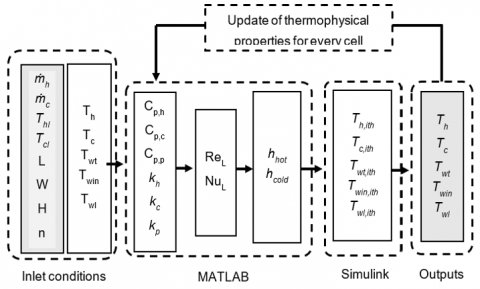 The operating principles of the model in Simulink are summarized in Figure 3. The initial temperatures of the fluids and the heat exchanger material, the mass flow rates of the fluids, and the geometric information of the channels through which the fluids pass were determined as inlet conditions. Reynolds and Nusselt's numbers are calculated with the help of MATLAB by determining the thermophysical properties of the fluids and the heat exchanger material according to the inlet conditions information. The heat transfer coefficients on both sides are calculated using Reynolds and Nusselt's numbers. The results obtained are transferred to the SIMULINK block diagram given in Figure 4, and the cell outlet temperatures of the fluids are calculated. These results establish the entry conditions for the next cell. The thermophysical properties of the fluids are recalculated according to the new entry conditions and the calculations are repeated until the last cell.