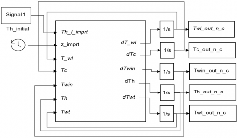 $m_{w, l} c_{w, l} \frac{d T_{w, l, n}}{d t}=h_c A_{w, l}\left(T_{c, n}-T_{w, l, n}\right)-\frac{k_{w, l} A_{w, c s s, l}\left(T_{w, l, n}-T_{w, l, n-1}\right)}{\frac{L}{n}}$ (14)