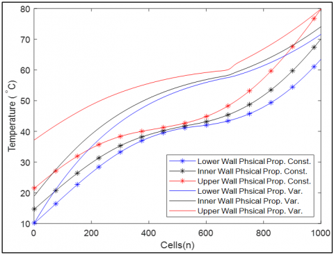 Figure 6 demonstrates the temperature distribution of the heat exchanger's upper, inner, and lower walls. The upper and lower wall temperature distributions versus cell numbers are observed to be identical with the hot flow and cold flow temperatures at the end of 20 s simulation time. For instance, inner wall temperatures for variable and constant properties are observed at 18℃ and 15℃ for the 1st cell and 75℃ and 70℃ for the 1000th cell.