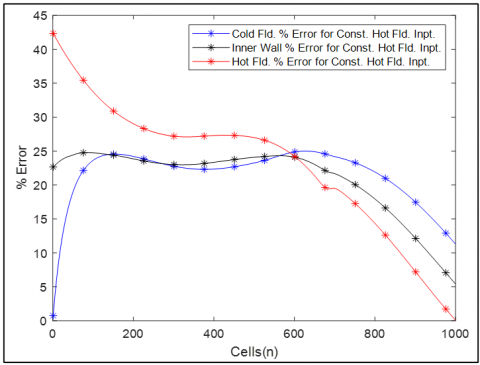 However, temperature errors in hot flow show continuously increasing values from the 1000th cell to the 1st cell. Next, errors show a rapid increase from zero to 24% up to the 600th cell. Then, the growth of the error becomes slower and reaches 27.5% up to the 350th cell. Finally, however, it shows a sharp increase from 27.5% to 42.5% up to 1st cell.
