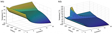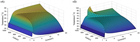 Response of the heat exchanger is observed with variable properties in Figure 9. The temperature distribution is generated depending on the cell number and time domain up to 1000th cells and 20 s, respectively. According to the 3-D surface response graphs in Figure 9 (a1), the temperature distribution for cold flow increases by increasing duration and cell number in the first five seconds and 200 cells rapidly. However, it is seen that the rate of growth in cold flow temperature decreases in the following seconds. When the cold flow meets the hot flow, it is seen in Figure 9 (a1) that the sudden temperature increase is seen in the 2nd second. Therefore, in the next seconds, the temperature increase decreases as the fluid temperatures approach each other. Figure 9 (a2) shows the reaction of the cold flow when a sudden temperature change of 60℃ is applied to the hot flow. According to this, it is seen that the temperature in the 1000th cell, where the hot flow enters, increases rapidly from the 4th second to 82℃ after 2 seconds. Then the temperature decreases slowly to 74℃ at the end of the 20th second. According to Figure 9 (b1), the hot flow inlet temperature drops suddenly from 80℃ to 62℃ in the first 3 seconds. This decrease is the high heat flux due to the wall temperature at 25℃ in initial conditions. In the following seconds, the temperature of the hot flow increases up to 78℃ with the increasing wall temperature, as seen in Figure 9 (c2), and decreases to 37℃ in the 1st cell at the end of the 20th second by transferring heat to the cold flow.