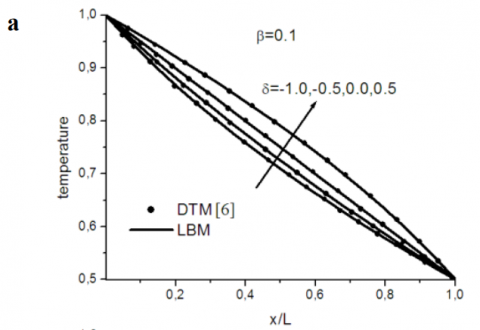 a = 0, ω=0.0, β = 10.0, εw = εE = 1.0, δ=0.0 and TW =3TE. The LBM results are in good agreement with those published.