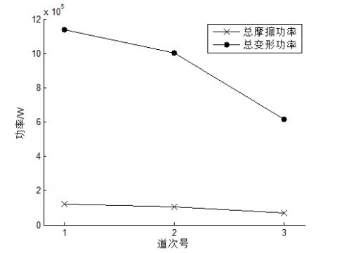 In Figure 3, from the distribution curve of unit area deformation power and friction power along the rolling direction of three passes, each pass of the friction power and deformation power distribution along the rolling direction are basically consistent. The backward slide area and the main fever area do not reach the maximum rolling pressure. However, there are high strain and the relative sliding velocity. The deformation reaches the peak power when the strip is near the entrance. The third pass is the final rolling pass. The rolling reduction is lower than the first two passes.The total deformation power is reduced more. Due to the slight decrease of rolling speed, the total friction power changes less.