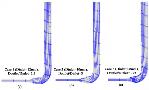 Figure 11. Effect of the diameter ratio (Doutlet/Dinlet) on streamlines