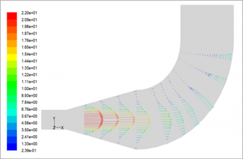 From figure 13it’s easy to conclude that the maximum value of axial velocity is shifted towards the outer wall as a result of pressure gradient caused by the balance of centrifugal force and pressure gradient in the bend. As the flow advances closer to the outlet the gas flow gradually evolves towards a fully-developed turbulent structure.
