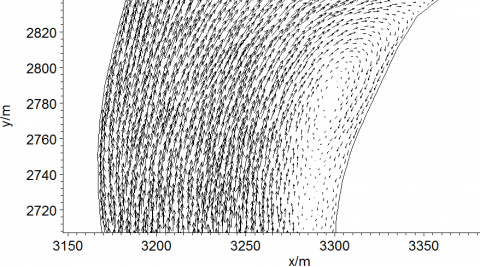 In a bend of rivers, because of the centrifugal force, the water near free surface flows from the convex bank to the concave bank, while the water near river bed flows in the opposite direction. The secondary flow on cross-section d04, d05 and d06 are shown in Figure 9, where the x-axis is the distance from the left bank, and the y-axis is the water level.