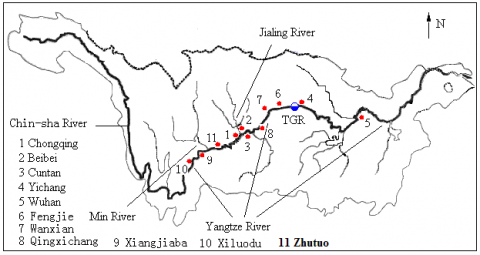 Zhutuo station is located in the entrance of TGR and Sabdouping station is located in the exit of TGR. The studied reach is ranged from Zhutuo station to Sandouping station with distance of 756.3 km, including 368 sections, and the average length between two sections is 2.06km. The stream coming from Jialingjiang River and Wujiang River is considered.