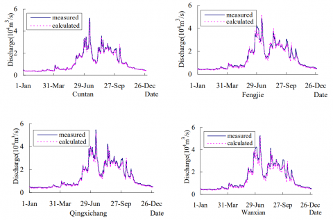 The comparison between measured discharge and calculated discharge of some stations in 2000 is displayed by Figure.3, it is indicated that the average difference between measured discharge and calculated discharge is 256m3/s, the errors is allowable.