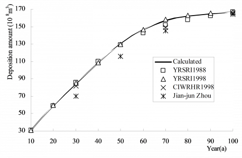 The flow and sediment series from 1961 to 1970 is adopt in the planning stage of TGR. In order to validate the model reliability deeply, TGR’s deposition amount in 100 years is computed with the flow and sediment series from 1961 to 1970 and the operation regulation provided by the Yangtze River Water Resources Commission (YRWRC) (The water level before the dam keeps 135m from 2003 to 2007; from 2007 to 2009, the operation regulation of 156m—135m—140m (normal water level—flood water level—lowest navigable level) is adopted; from 2009 to 2102, the operation regulation of 175m—145m—155m (normal water level—flood water level—lowest navigable level) is adopted.). Figure.4 display the calculated deposition amount and the results provided by the Yangtze River Scientific Research Institute (YRSRI) (YRSRI, 1988, 1998), China Institute of Water Resources and Hydropower Research (CIWRHR) ( IWRHR, 1998) and ZHOU (Zhou et al., 2000).