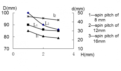(1) For the spinning part of the same head, the effect of the spin pitch was small. With the increase of spin pitch H, the section shape remained the same, but the outside diameter D of the section circle was reduced, and the inner diameter D remained basically unchanged, so the influence on the outer diameter was clear. Because the spin pitch increased, the rising angles of the spiral channels became bigger under equal a length of material, and the spin degree was lesser, which