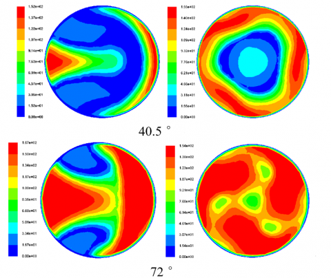 As can be seen by comparison, the vortex throttle’s low speed area in most of the opening degrees of the throttle valve is smaller than the conventional throttle, and the maximum speed on the outlet section is larger than the conventional throttle. When the throttle valve is fully opened, the speed of the conventional throttle is greater than that of the vortex throttle on outlet interface.