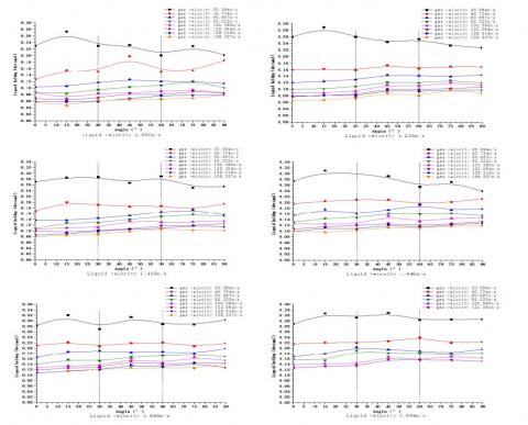 At the same gas and liquid velocity, liquid holdup and pressure drop changed with the inclined angle. At a certain liquid flow velocity, Figure 7 is respectively liquid holdup curve at different inclined angles at the same gas flow velocity. It can be seen from the charts, liquid holdup increased at first on the whole as the inclined angle increased, and then had a decreasing trend, and liquid holdup is largest in the angle range of 30° to 60°.