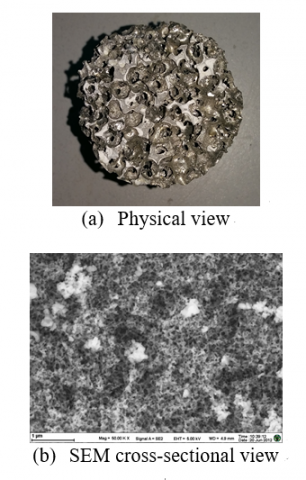In recent years, foam metal has enjoyed extensive application prospects in the field of enhanced heat transfer. Since foam metal has a relatively large specific surface area and a complex three dimensional hole mesh structure, it has an efficient heat transfer effect when fluid goes through it. Figure 1 illustrates the physical view of a foam metal ball and its SEM cross-sectional view. At the same time, phase change materials like paraffin and ice-water are used in thermal storage and cool storage engineering projects. Foam metals filled with phase change materials not only have a good heat transfer effect, but also a high energy storage density. Therefore, the porous medium composite phase change materials have a more important research value. They have wider application fields than foam metal.