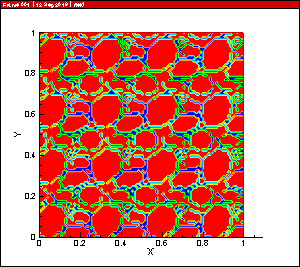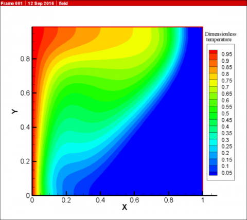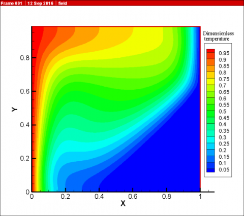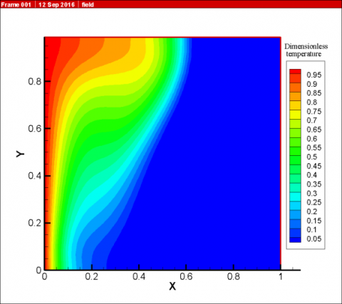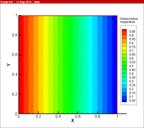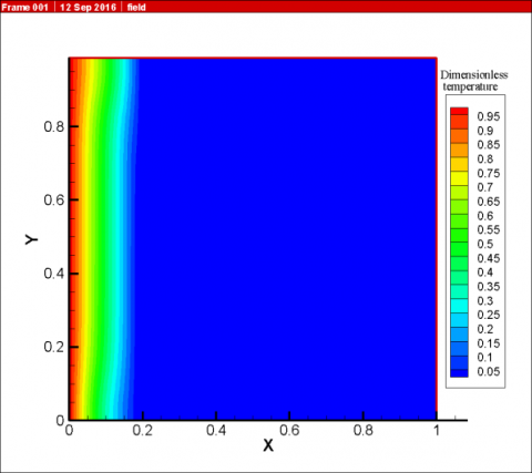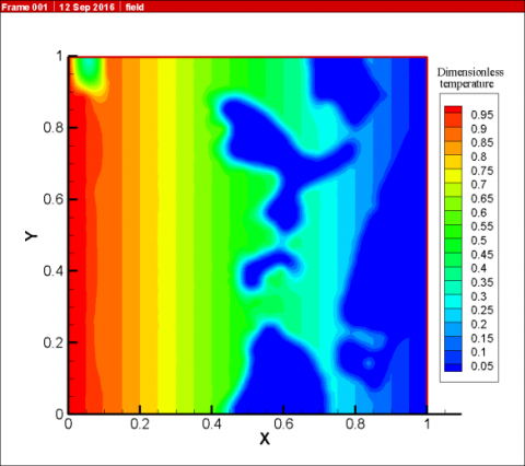 In the calculation, set Ra=5×105, Pr=5.0 and a dimensionless temperature difference between the left side and the right side of T’=1.0, use the 100×100 mesh grid and the D2Q9 model. The calculation process is shown below:
