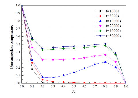 From Figure 6, after calculating 1,000 steps in the initial time, the isotherm distribution is approximating linear near the left side wall of pure PCM. The heat exchange between the left and right side at the initial moment is mainly the effect of heat conduction. As time goes by, the mechanism of heat transfer between the left and right sides gradually changes from heat conduction to heat convection. The calculated results shown in Figure 5 fully agree with the existing experimental results obtained by Zhenqian Chen18.