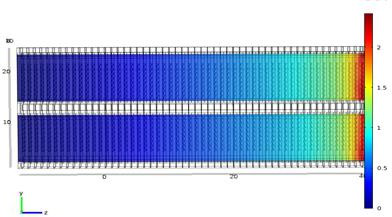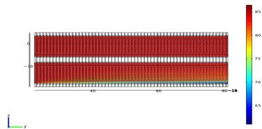 The analysis model (Figure 3) is constructed with several equal-length radiating tubes consisting of 60 half-symmetrical radiating fins (fin spacing: 1mm). The air flows in the x-axis direction. The inlet and outlet sections of the unit flow channel model are extended to ensure the uniform inlet flow rate. There is no reflux in the fluid at the outlet. Because the radiating fin is very thin and large in size, dividing the solid model of the radiator into grids would generate numerous grids and costs a lot of computing resources and time. To reduce computational load, the fin structure at the core is simplified to an area of porous medium during the simulation of airside heat transfer of the radiator [15, 16, 17].