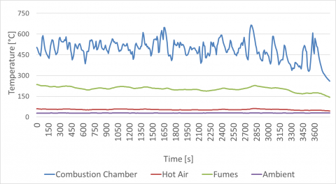 With four thermocouples connected to a TC-08 Data Logger the temperatures of fumes, ambient, combustion chamber and hot air were monitored.