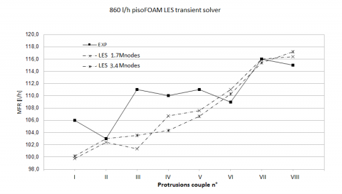 Figure 16. CFD vs. experimental mass flow rates comparison at 860 l/h with LES turbulence model (transient solver)