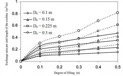 The effective area of heat exchange Atot is determined by the geometrical dimensions of the drier and in particular by the diameter of the auger, but above all by the degree of filling. The latter is an important factor in SCD systems, which must be chosen according to the characteristics of the material and it affects handling, flow rate and degree of drying. For granular minerals, the recommended values, and those used in the literature, are in the range 0.15 to 0.45. In this range two important factors are guaranteed: efficiency in transporting all the material towards the exit and mixing and then heating it with homogeneity.