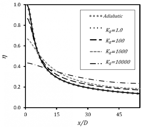 The effect of solid wall thermal conductivity is investigated by evaluating various thermal conductivity ratios $K_R$. Thermal conductivity ratio is defined in Eq. 7 as the ratio of thermal conductivities of the solid wall to the coolant air at 360 ℃.